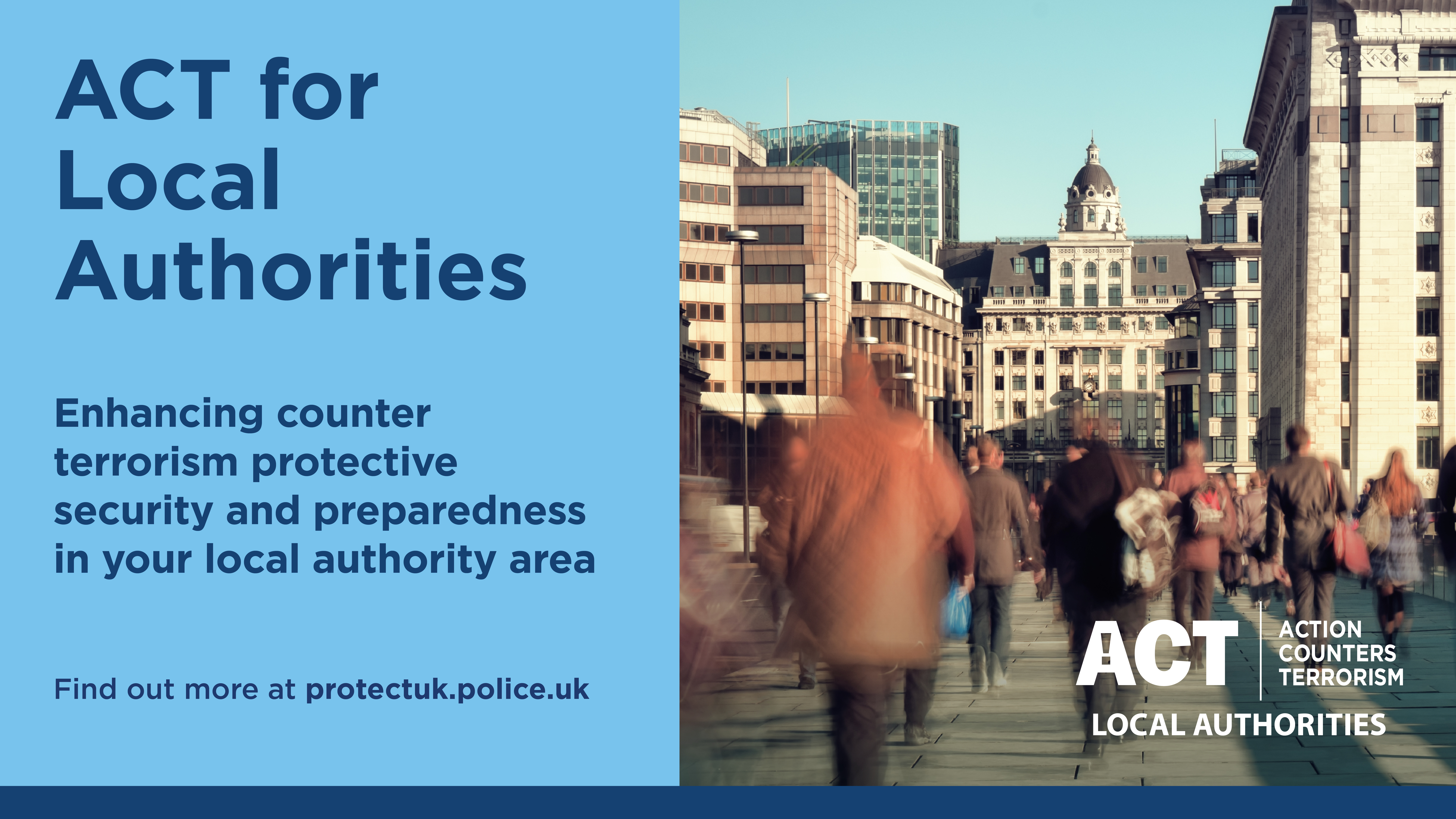 Local authorities can access the resources – including toolkits and videos for each of the five priority areas – at ProtectUK ACT for Local Authorities to support their consideration and understanding of terrorist risks, protective security and preparedness.